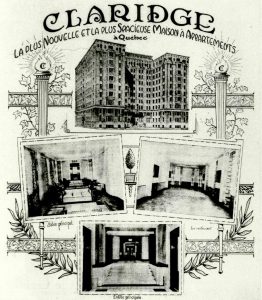 Il ne s’agit pas du premier immeuble locatif de prestige à Québec. En 1911, un tel édifice a été érigé au 580, Grande Allée Est. Près de quinze ans plus tard, un promoteur montréalais avait fait construire le Château Saint-Louis, situé au 135, Grande Allée Ouest. Le succès éclatant de ce projet convainc en 1928 le notaire et investisseur Rodolphe Mackay d’acquérir le site actuel du Claridge et d’y construire, avec des associés, les Appartements Lafontaine[7]. À l’instar du Château Saint-Louis, le nouvel immeuble adopte la forme d’un H afin de maximiser l’ensoleillement des logements. Cependant, les architectes Ludger Robitaille et Gabriel Desmeules préfèrent une ornementation de style Art déco à l’influence baroque du Château Saint-Louis. Tout est prévu pour attirer la clientèle à la recherche de services et de sécurité[8]. La construction de l’édifice est suspendue temporairement à la suite de la faillite, en 1929, des Appartements Lafontaine limitée, l’entreprise cofondée par Mackay. Le bâtiment est renommé à la suite de son acquisition par la Claridge Realty Corporation Limited en 1931. C’est d’ailleurs ce nouveau nom qui apparait à la une du Soleil en septembre 1931[9]. Entrant en déclin dans les années 1960, Le Claridge n’est qu’à moitié occupé lorsqu’un important travail de rénovation et de modernisation est entrepris en 1994. L’ensemble locatif est alors converti en copropriétés.