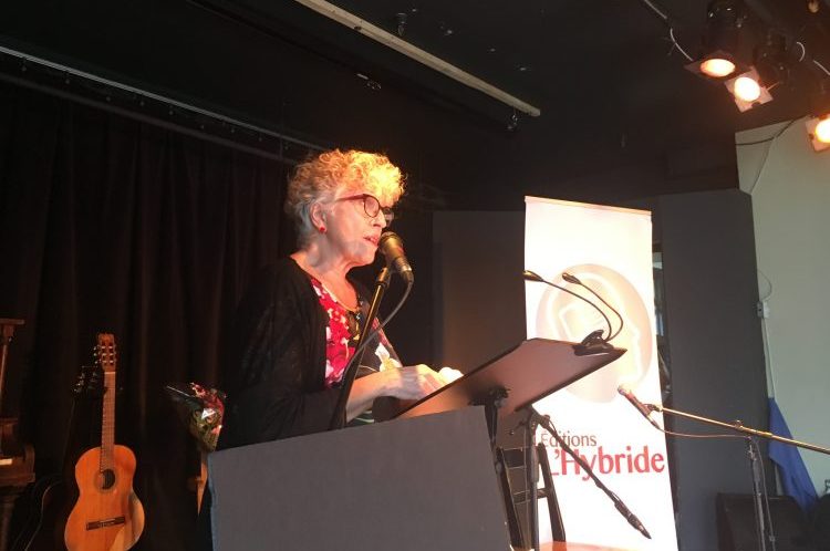 En préambule, Stéphane Robitaille nous a offert une sympathique prestation musicale. Puis vint le temps des discours, des présentations, et… de la lecture par Renée Hudon elle-même de trois textes de l’auteur, dont le très émouvant « La Tape dans le dos« , à l’issue duquel elle dit que c’était un honneur pour elle que de dire de tels textes, et qu’elle le ferait tous les mois si on lui demandait.