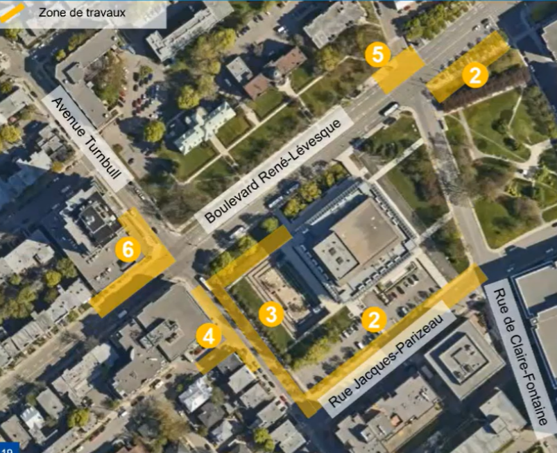 La suite des travaux s’étale sur six phases, de novembre 2022 à juin 2023. La première phase, qui doit débuter sous peu et durer jusqu’en décembre, concerne la rue de Claire-Fontaine, au sud de René-Lévesque. Elle sera fermée à la circulation sur toute la durée des travaux, et le boulevard René-Lévesque devrait être réduit à une voie de circulation pendant une semaine avant de revenir à deux voies. Au cours de l’hiver et du printemps 2023, plusieurs phases se feront de manière successive, sauf une phase, la cinquième, qui concerne l’intersection nord de Claire-Fontaine et René-Lévesque, et qui se fera de manière simultanée. L’image ci-dessous montre le découpage des travaux selon les phases.